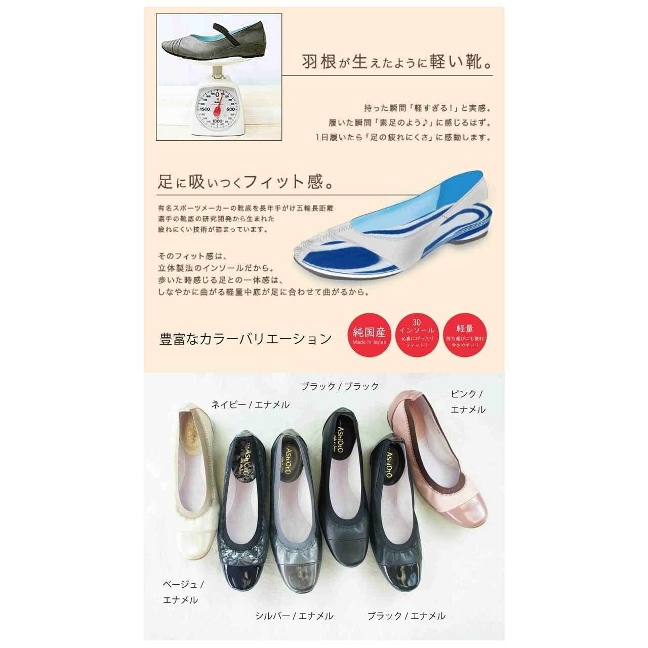 【日本製・超軽量・長く歩ける靴】〈アシオトの定番商品!超軽量で持ち運びも便利!〉牛革ボロネーゼバレエパンプ